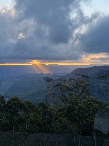Michelle and Richard gazed out through the enormous windows of the Wintergarden Restaurant. The sun was setting, bestowing its last benevolent rays across the sky above the Megalong Valley far below. Orange-streaked clouds, highlighted against the bruised blue cloud formations, were extraordinarily beautiful tonight.