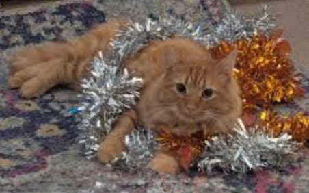 We had no trouble getting Little Horatio to sleep. He is only two years old so hasn’t learnt to work up to a frenzy of excitement as yet. He was intrigued that we should leave Christmas cake and milk for Santa and tried to feed the Reindeer’s carrots to Hero. Hero would have been quite happy to eat them given half a chance. After dinner, Horatio eventually consented to sit on Mother’s lap for a Christmas photo, but insisted that Sebastian the Cat should have his photo taken too… with tinsel.
